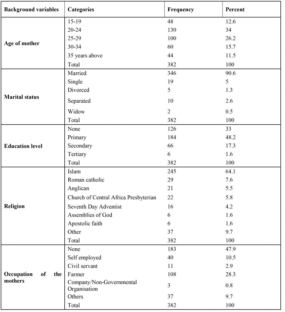 The total sample size was 384 using the Cochran formula. This sample size was calculated at a confidence level of 95% and a margin of error (degree of accuracy) of ±5%. The study used the power of 80 percent. A total of 382 participants responded to the study, representing a 99.5% response rate. Two respondents voluntarily withdrew from the study. Participants were interviewed using the questionnaire. Qualitatively, five focus group discussions were conducted. One focus group discussion composed of ten purposively selected participants was conducted at each study facility.