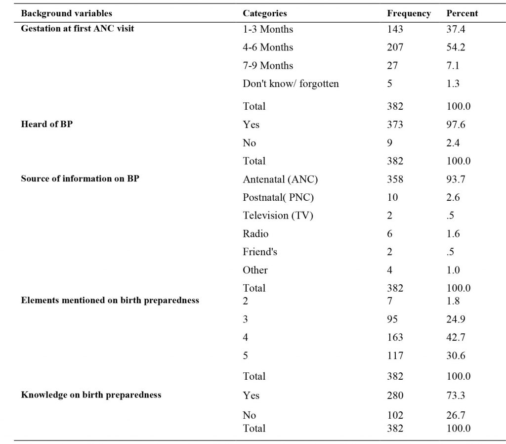 Among the total study participants, (54.2% n=207) had started antenatal care at 4-6 months of gestational age, while (37.4 %, n=143) of the women started antenatal care at a gestational age of 1-3 months. In addition, (7.1%, n=27) women had started antenatal care at 7-9 months of gestation, while (1.3%, n=5) said they did not know. Many women (97.6%, n=373) responded that they had heard about birth preparedness (BP), while (2.4%, n=9) of respondents said they had never heard about birth preparedness.